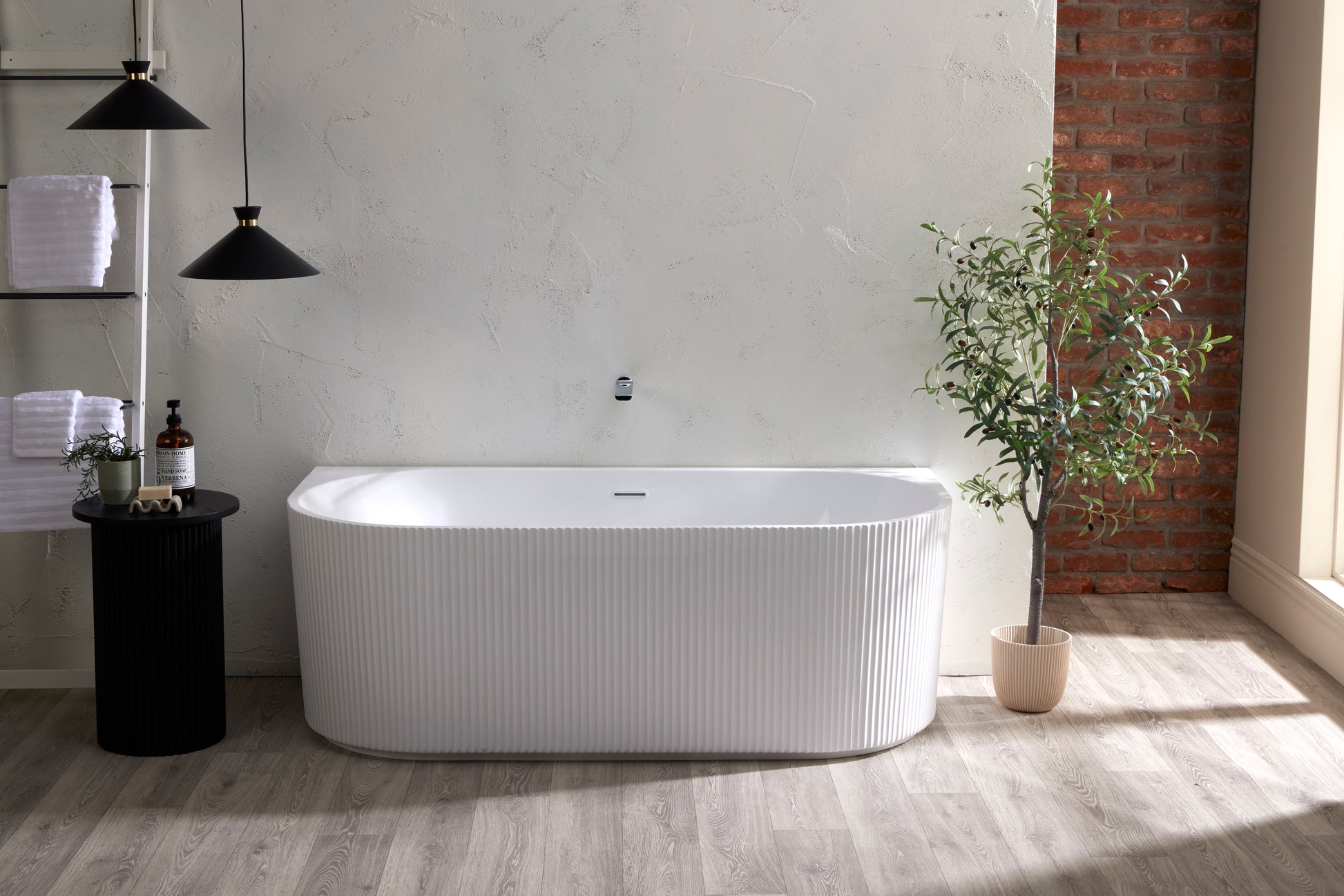 Fluted back-to-wall freestanding bath with elegant detailing